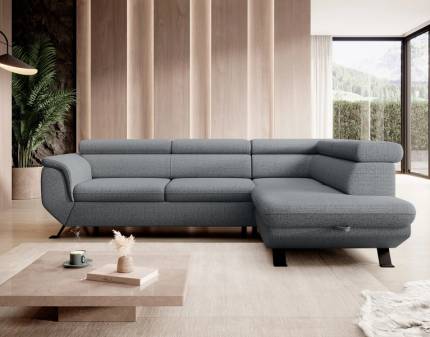 Coltar extensibil NAOMI U material textil gri, cu lada pentru depozitare 223x336x171cm