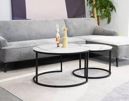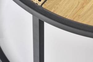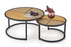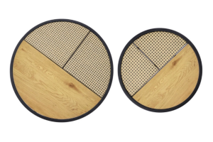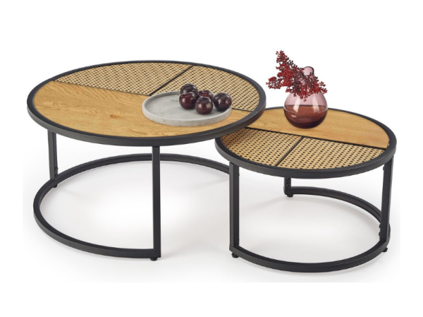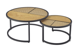 Set 2 masute GARMINA din MDF furniruit si rattan sintetic stejar, metal negru 50xH38cm / 70xH36cm