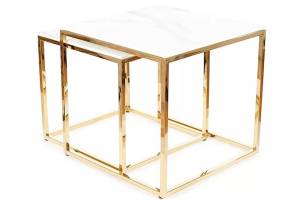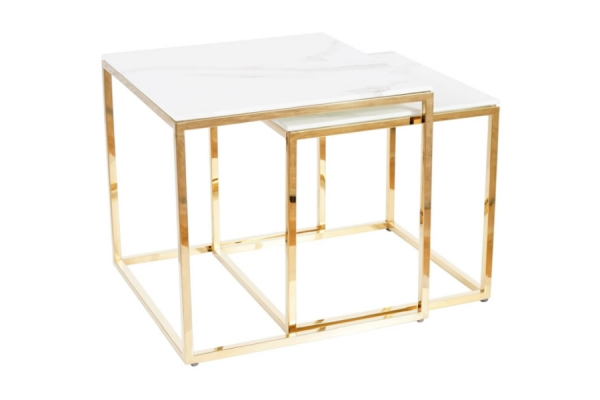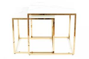 Set 2 masute GLORIA din sticla cu efect de marmura alba, metal auriu 45x45xH43cm / 40x40xH38cm